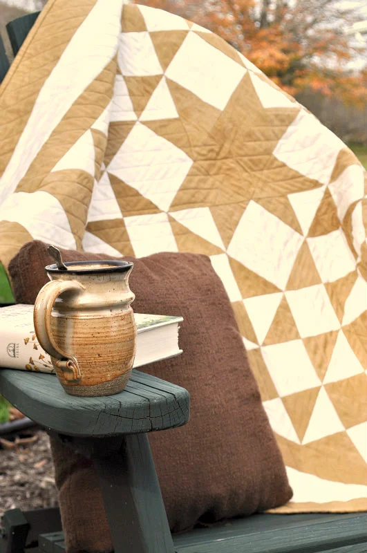 Harvest features a Twin Star block framed by alternating rows of quarter square triangles. It effortlessly comes together as a modern medallion quilt. The striking two-color design is shown in Tobacco and Natural, although it would look very smart in red, navy, or any other strong contrasting color. A quick and easy project, it's an excellent skill builder for the advanced beginner. I’ve used straight line quilting, but this design lends itself to endless quilting options.